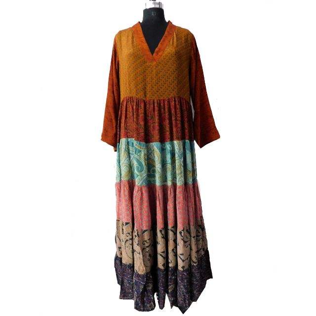 Vestido largo de seda para mujer, túnica larga multicolor hecha a mano, vestido de noche de retazos de seda, Vestido largo de diseñador de seda