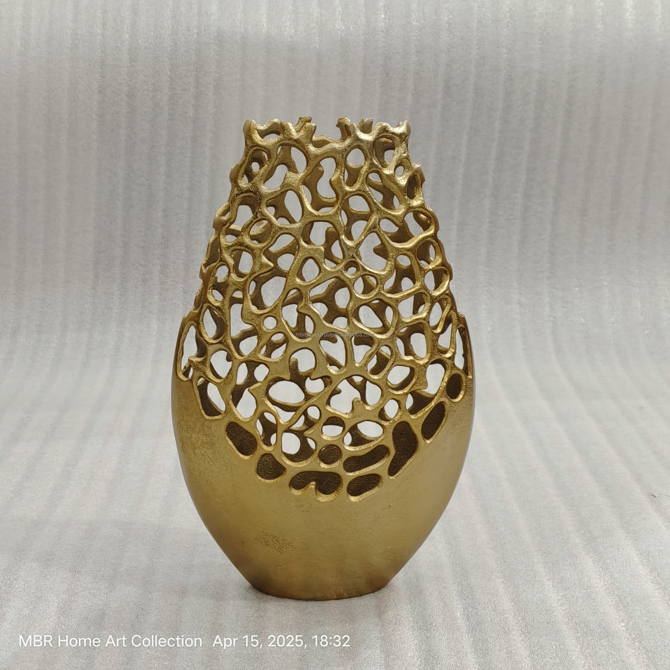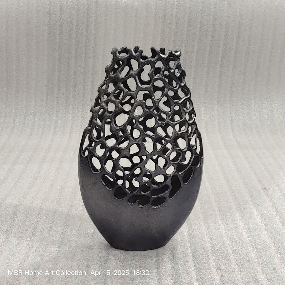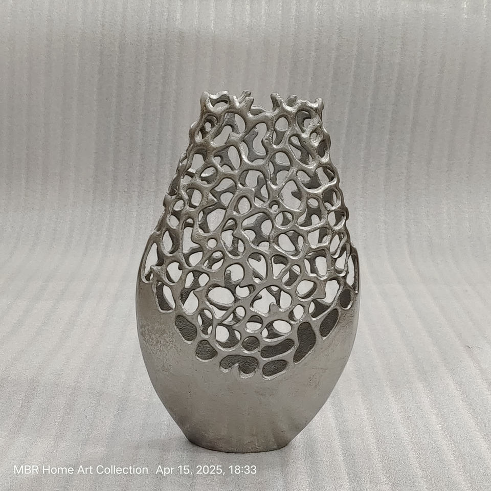 Jarrón redondeado de aluminio plateado con entramado abierto de forma libre
