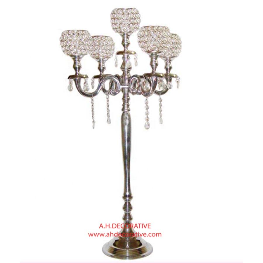 Candelabro de plata, 5 brazos con bola de cristal para decoración de luz de té, cuentas colgantes de cristal, candelabro de Metal hecho a mano de nuevo diseño