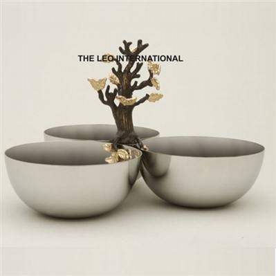 Tazón Decorativo Japonés Único de Metal de Aluminio y Acero Inoxidable con Diseño de Rama de Árbol y Hoja en Color Plateado, con Tres Compartimentos