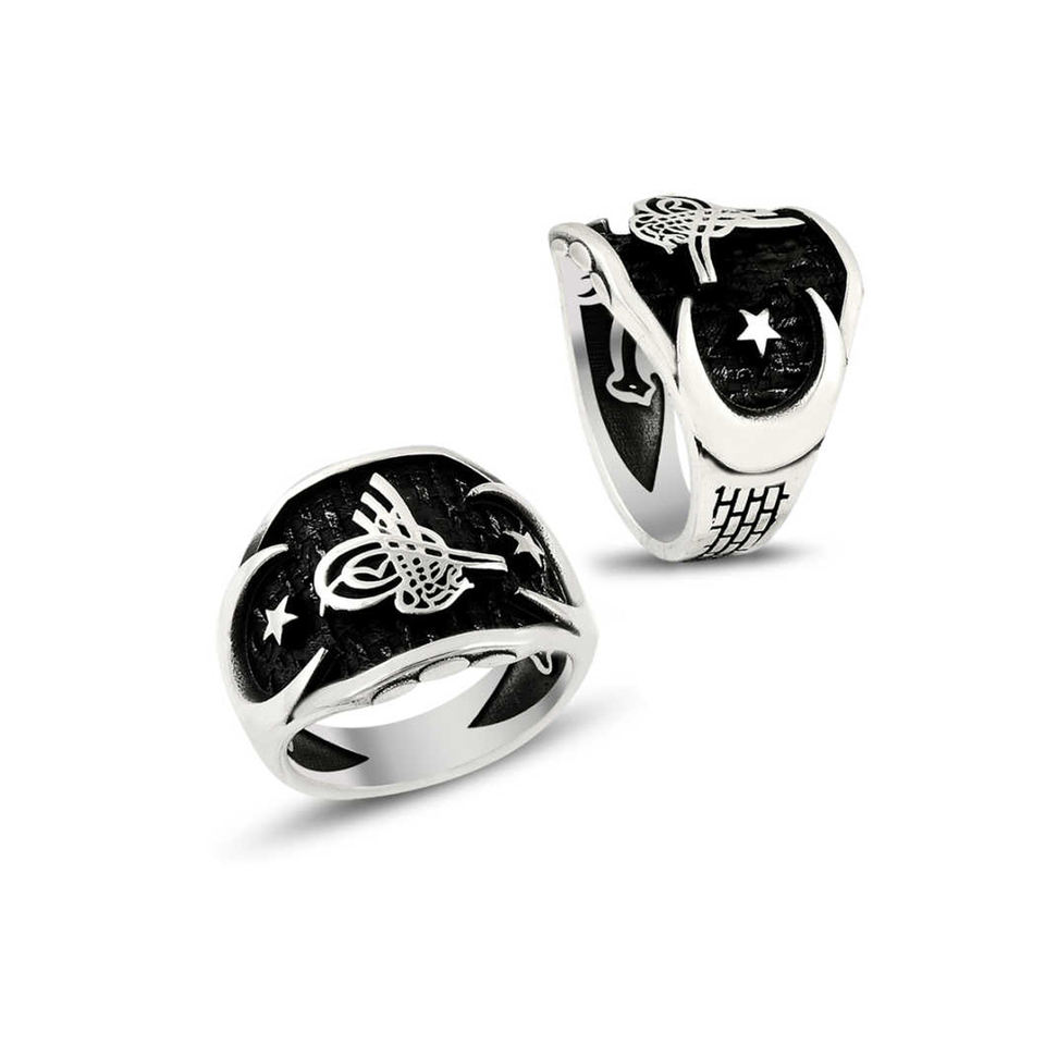Anillo de plata para hombre con diseño de garra y patrón Tughra sobre fondo negro