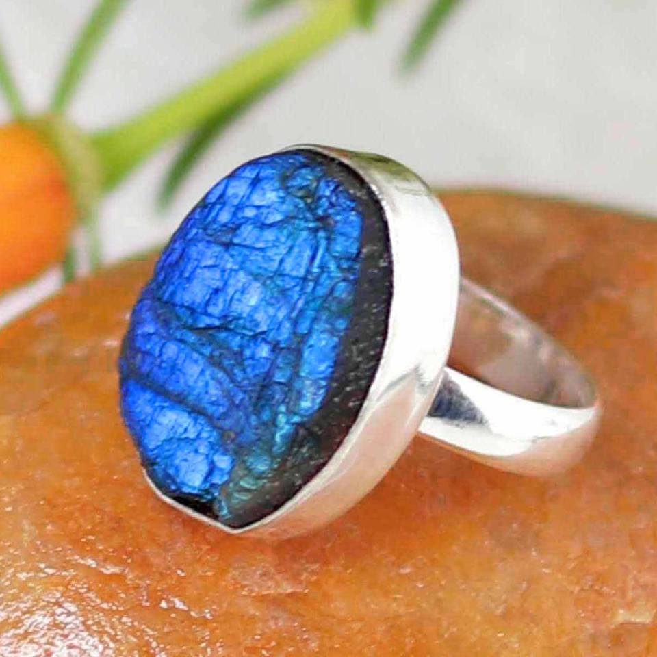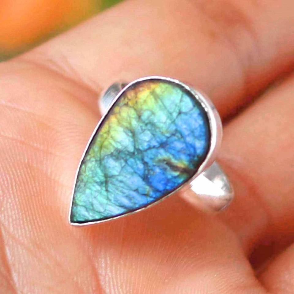 Anillo de Boda Clásico con Incrustaciones de Plata, Labradorita Druzy, Engaste de Plata Alemana
