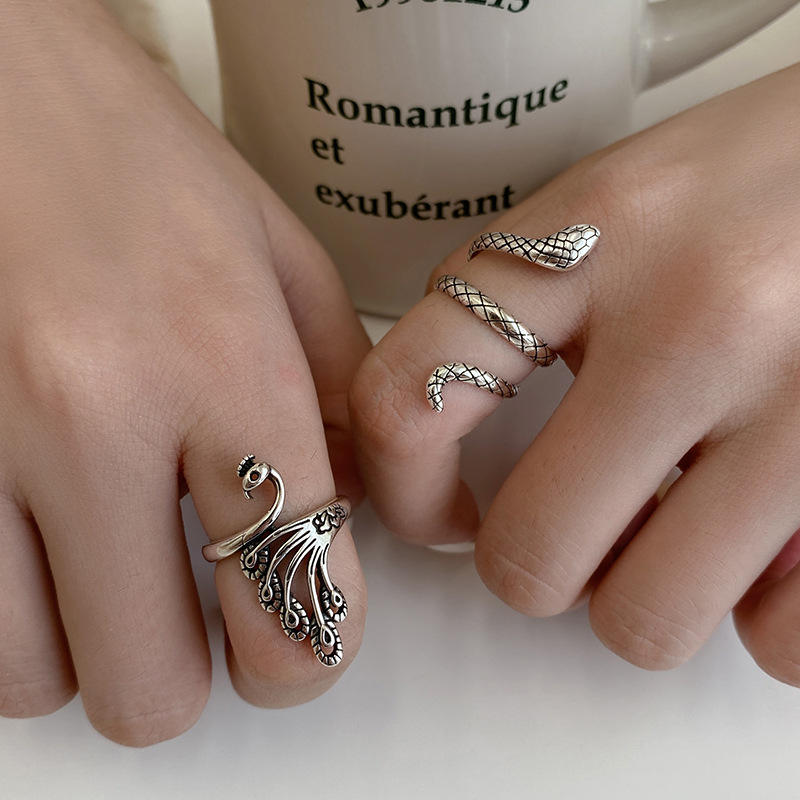 1 pieza/bolsa OPP para joyería chapada en plata, tamaño ajustable abierto, diseño Animal Vintage, anillo de pavo real, anillos en forma de serpiente para hombres o mujeres