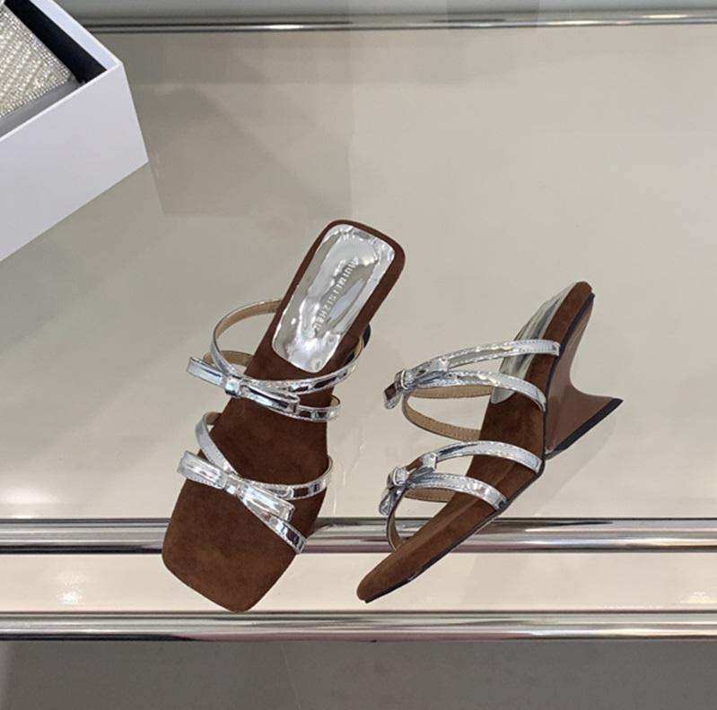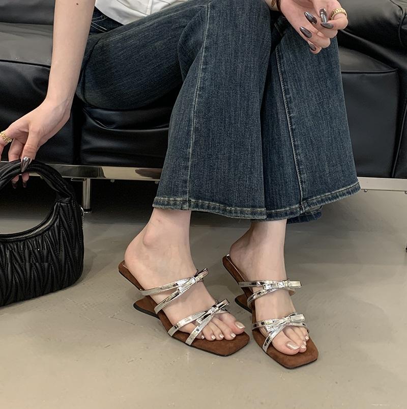 Sandalias Plateadas con Lazo, Punta Cuadrada, Plataforma, Zapatos de Verano para Mujer, Nuevo Estilo, Pantuflas
