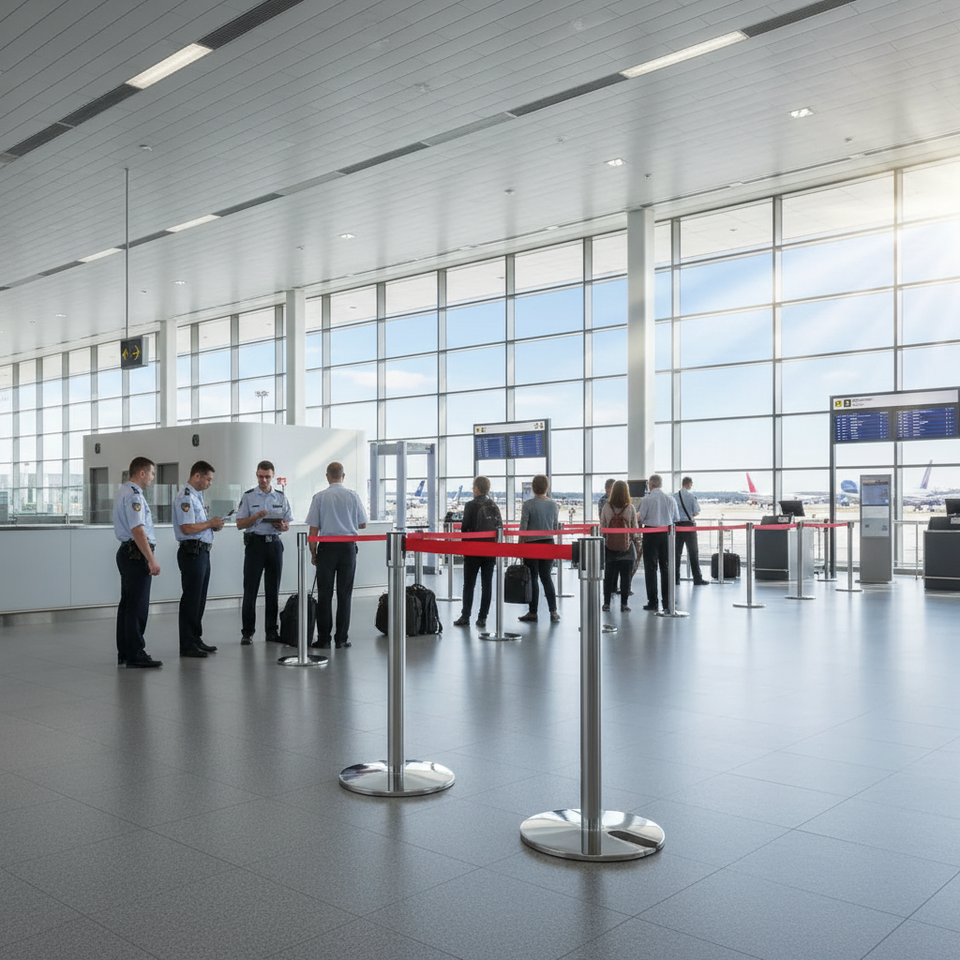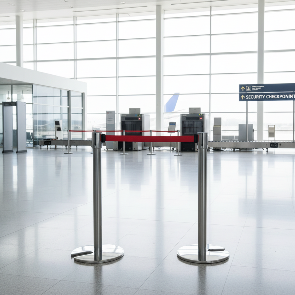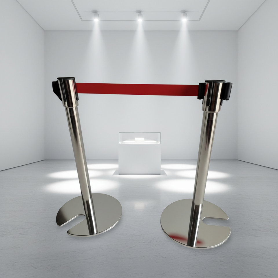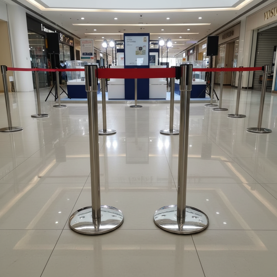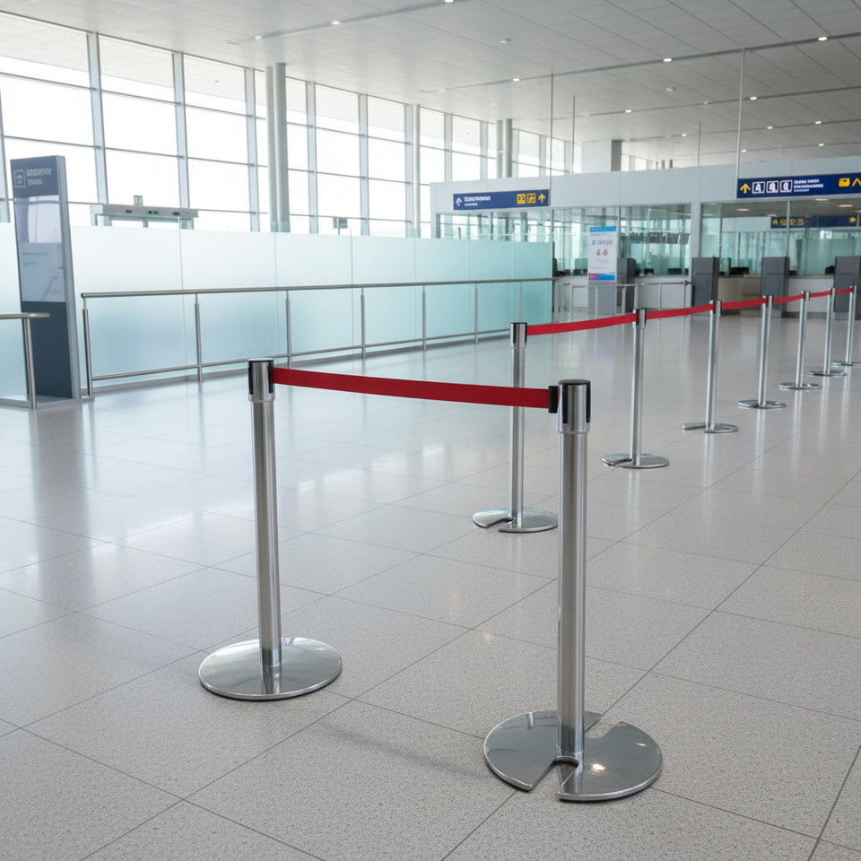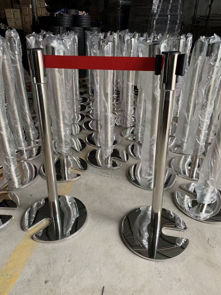 Poste de separación telescópico apilable de acero inoxidable plateado con barandilla en forma de U para colas y bancos