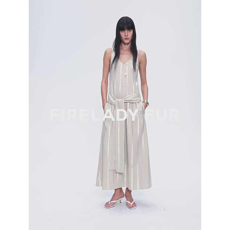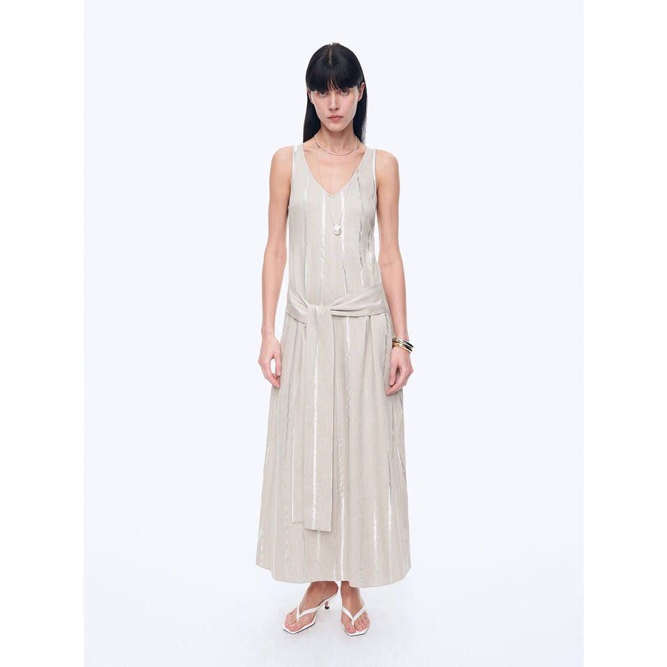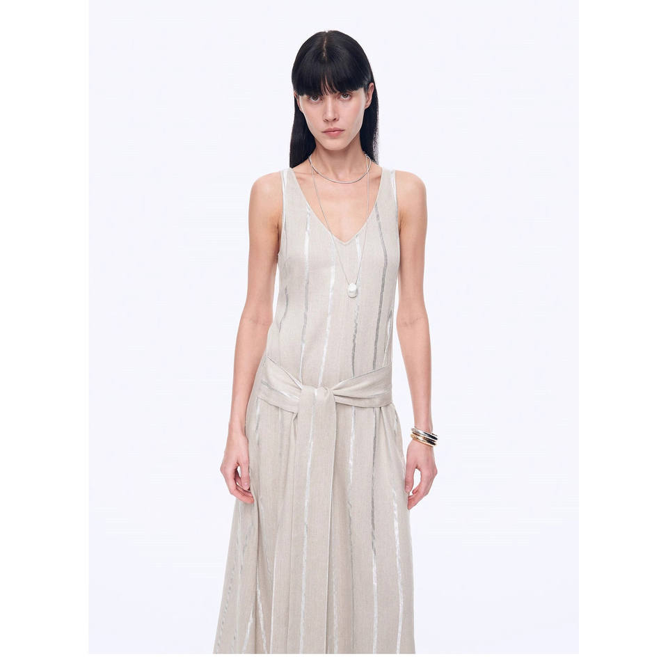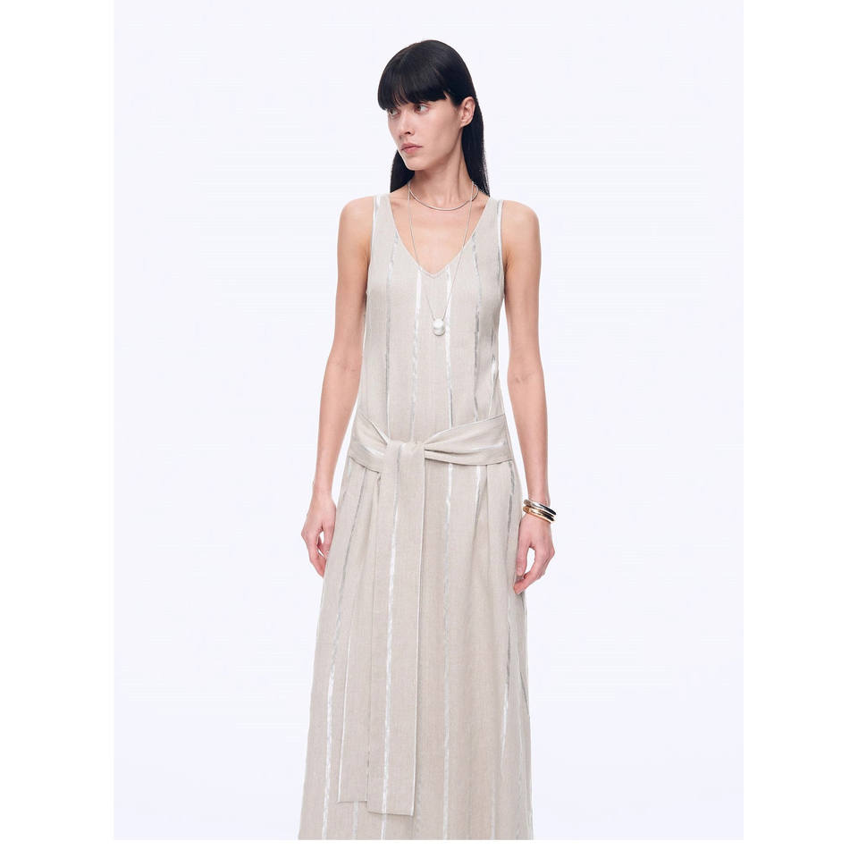 Vestido de Lino con Rayas Plateadas y Cuello en V, Estilo Drapeado, Modelo "Milan Holiday"