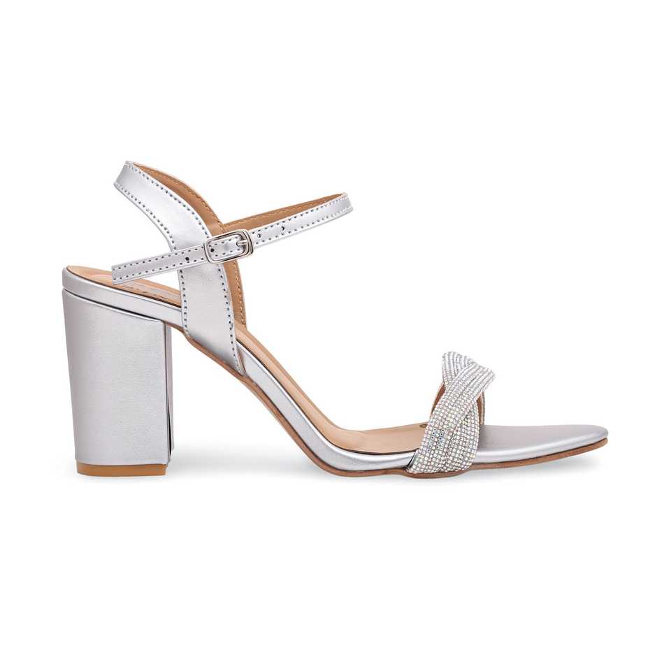 Sandalias plateadas de tacón para mujer con punta abierta FN5570 de moda correa en el tobillo y plantilla de PU con cierre de cordones