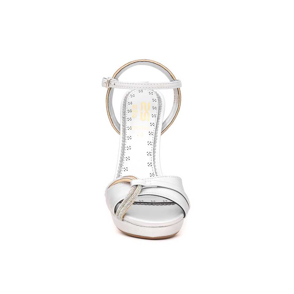 Sandalias de tacón de mujer plateadas con punta abierta a la moda FN5546 Plantilla de PU con cierre de cordones y correa en el tobillo