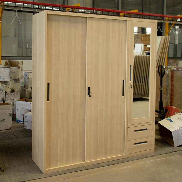 Sencillo 3 Puertas 2 Cajones Espejo Diseño Woodgrain Almirah Paños Almacenamiento Armario Acero Metal Madera Armario Dormitorio Proveedor