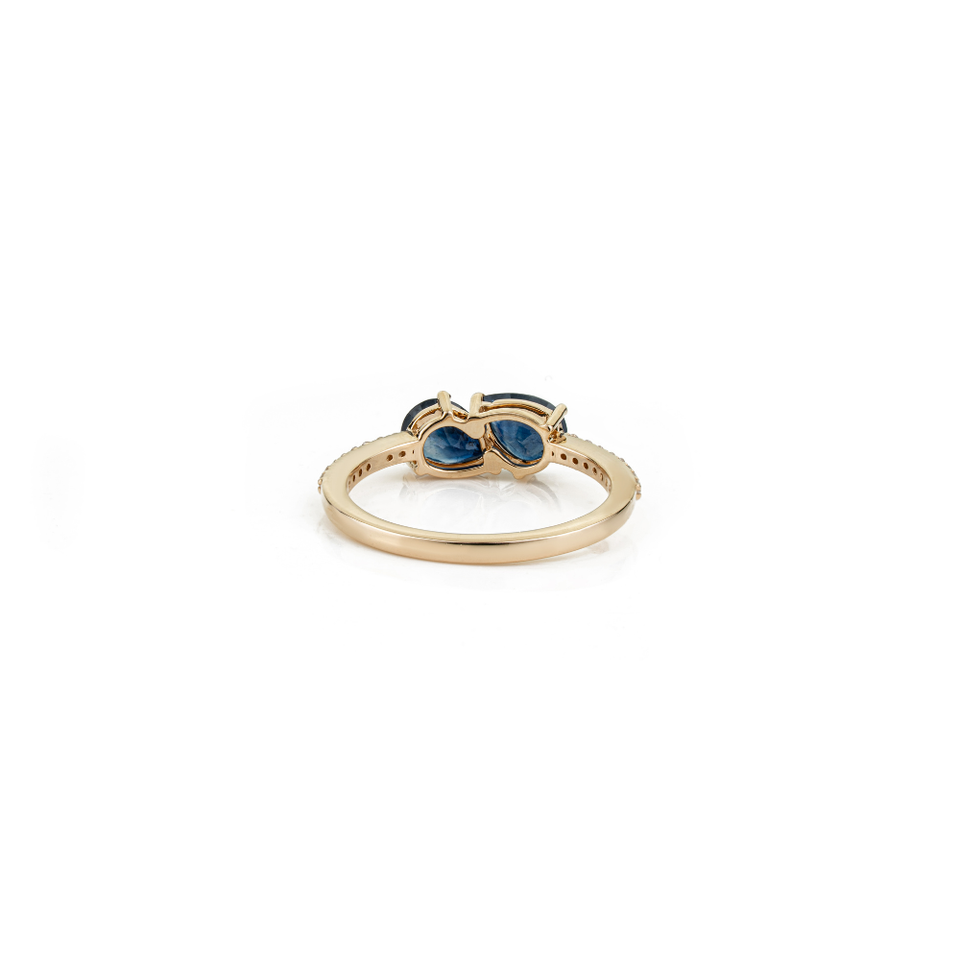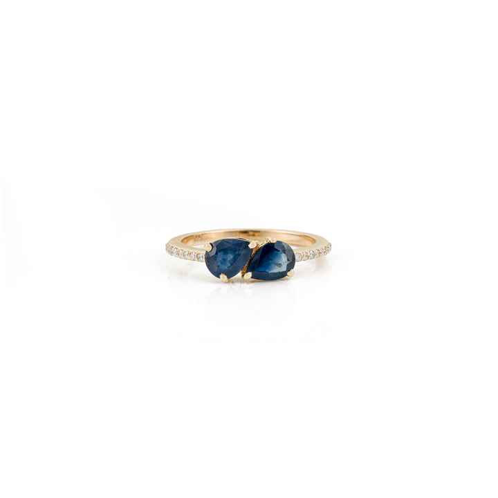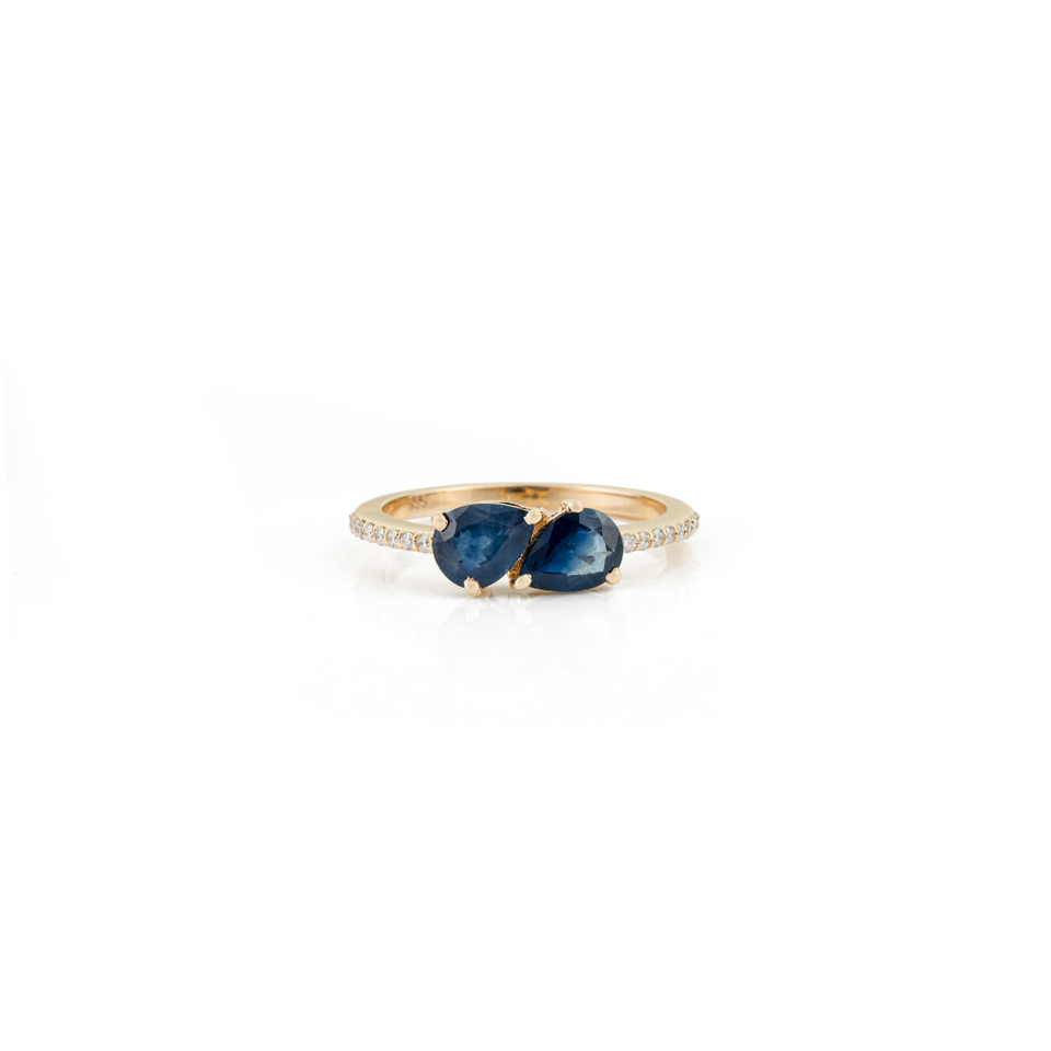 Anillo apilable de oro amarillo macizo de 14 quilates con zafiro azul en forma de pera y diamantes, de diseño simple y moderno, para uso diario.