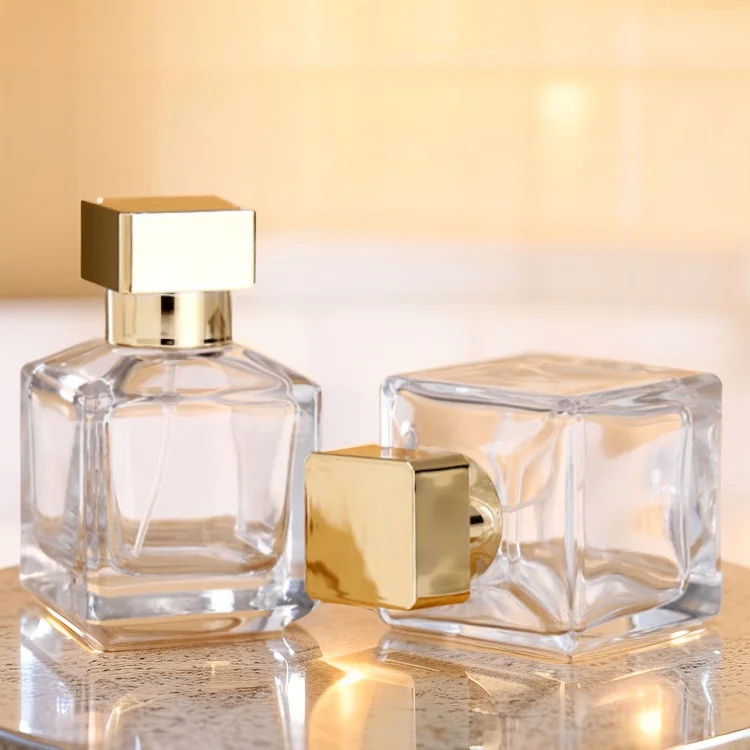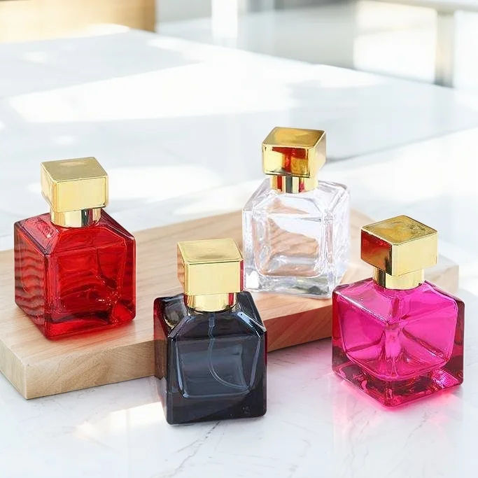 Botella de vidrio de spray de perfume transparente de color rosa rojo azul cuadrado de 50ml de moda simple con tapa dorada
