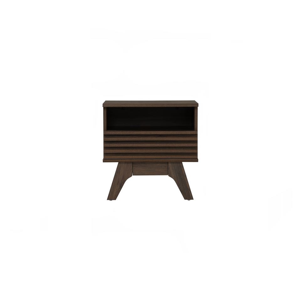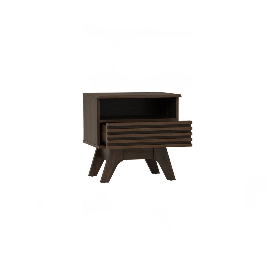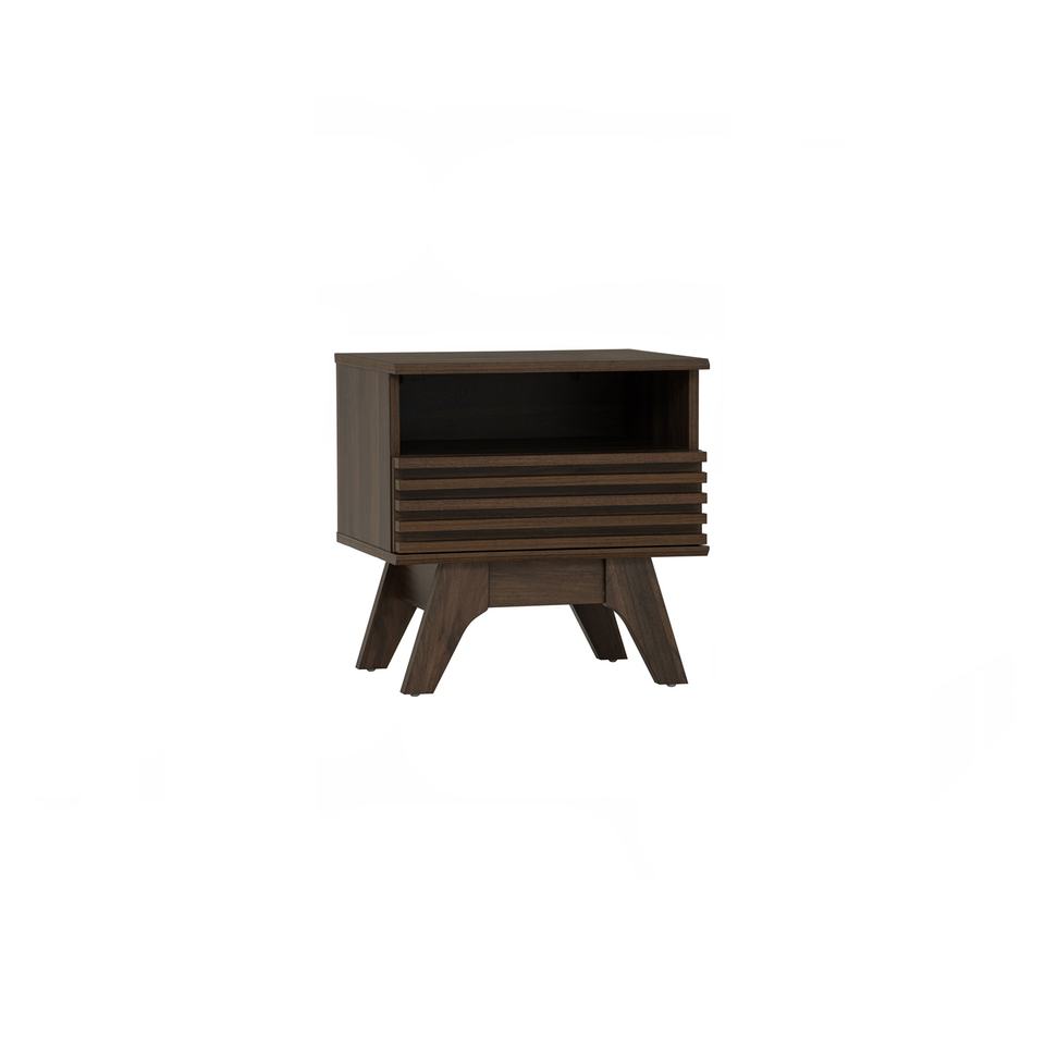Mesa de Noche Moderna FLORO de Madera Laminada Simple Color Nogal, Mesa Auxiliar Minimalista y Duradera para Dormitorio