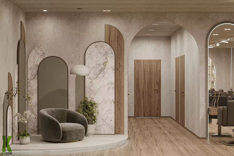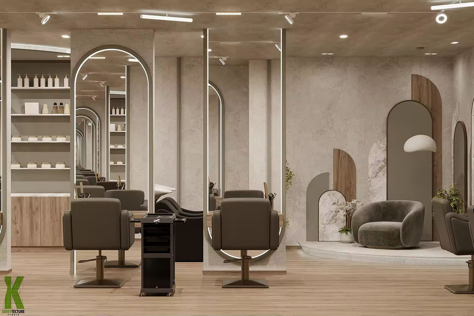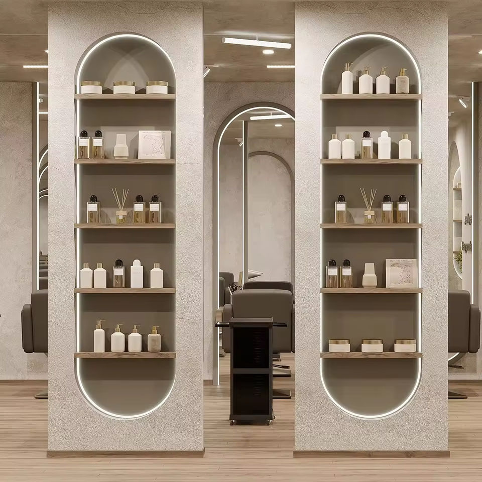 Diseño Interior Simple para Salón de Belleza, Mueble de Barbería con Superficie de Piedra Personalizada, Mueble de Exhibición Artístico para Salón