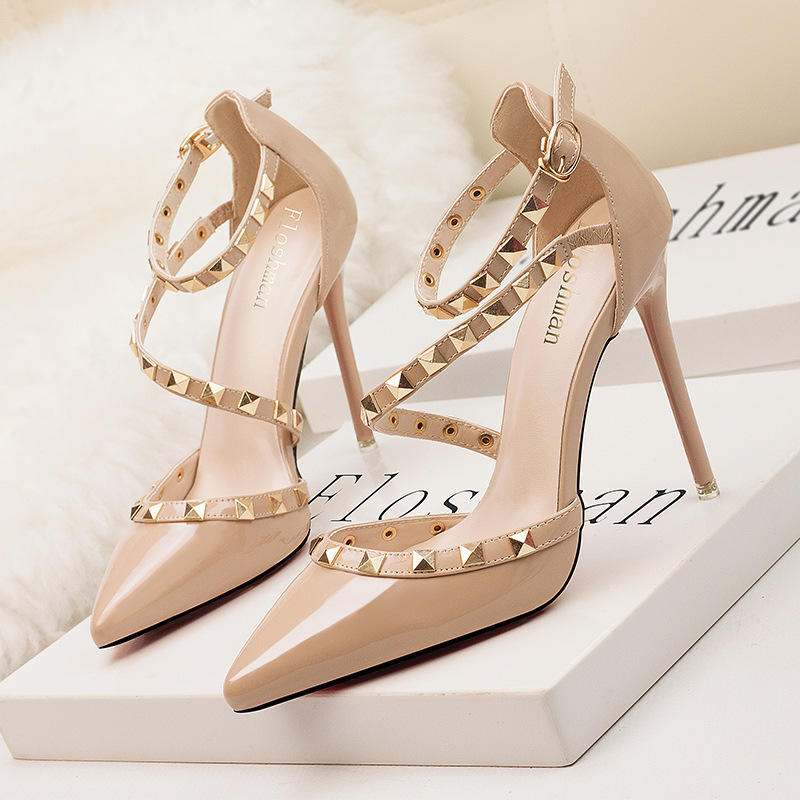 Simple sexy club nocturno stiletto tacones altos boca baja puntiaguda remache hueco sandalias de una correa