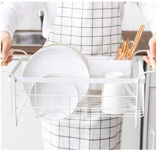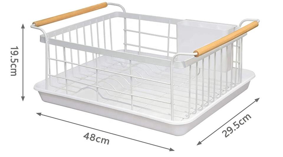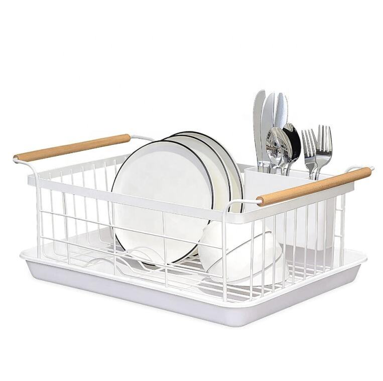 Escurridor de Platos de Una Sola Capa con Mango de Madera, Porta Utensilios, Escurridor de Platos para Encimera de Cocina