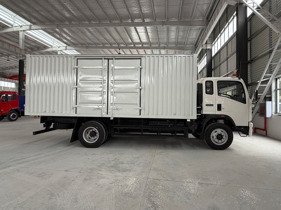 Camión de carga Sinotruk Howo con cabina extendida, volante a la derecha (RHD) y a la izquierda (LHD), con cabina dormitorio y plataforma de carga larga cerrada para transporte de mercancías.