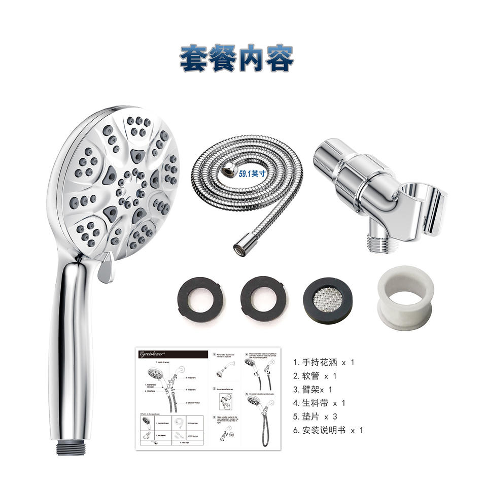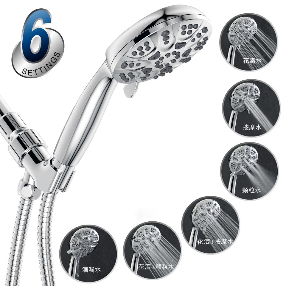 Juego de cabezal de ducha de seis funciones, cromado, redondo, portátil, con pulverizador, masajeador y efecto lluvia, accesorios de baño