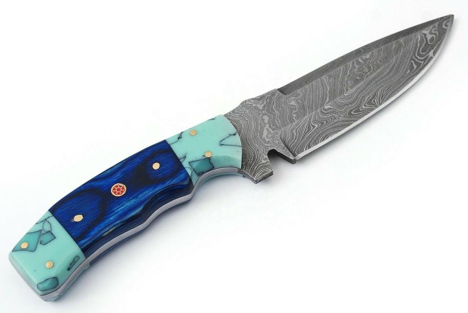 Sizzco hermoso cuchillo de hoja forjada fija hecho a mano de acero de Damasco con mango de resina acrílica de madera diseño OEM para caza Camping