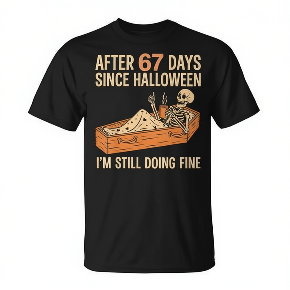 Camiseta con meme de Halloween de Esqueleto en Ataúd 67 Días, cuello redondo, negra