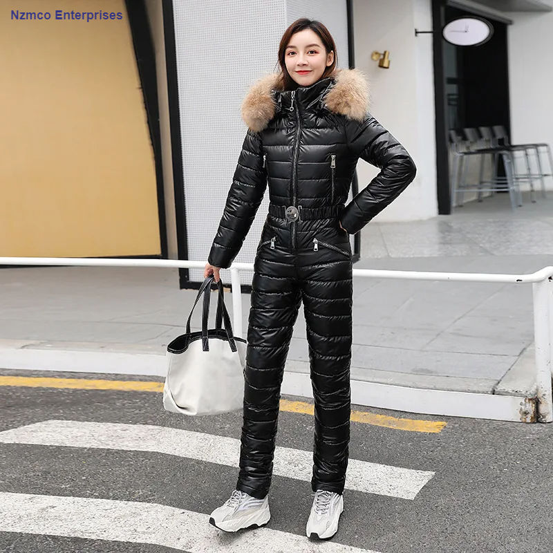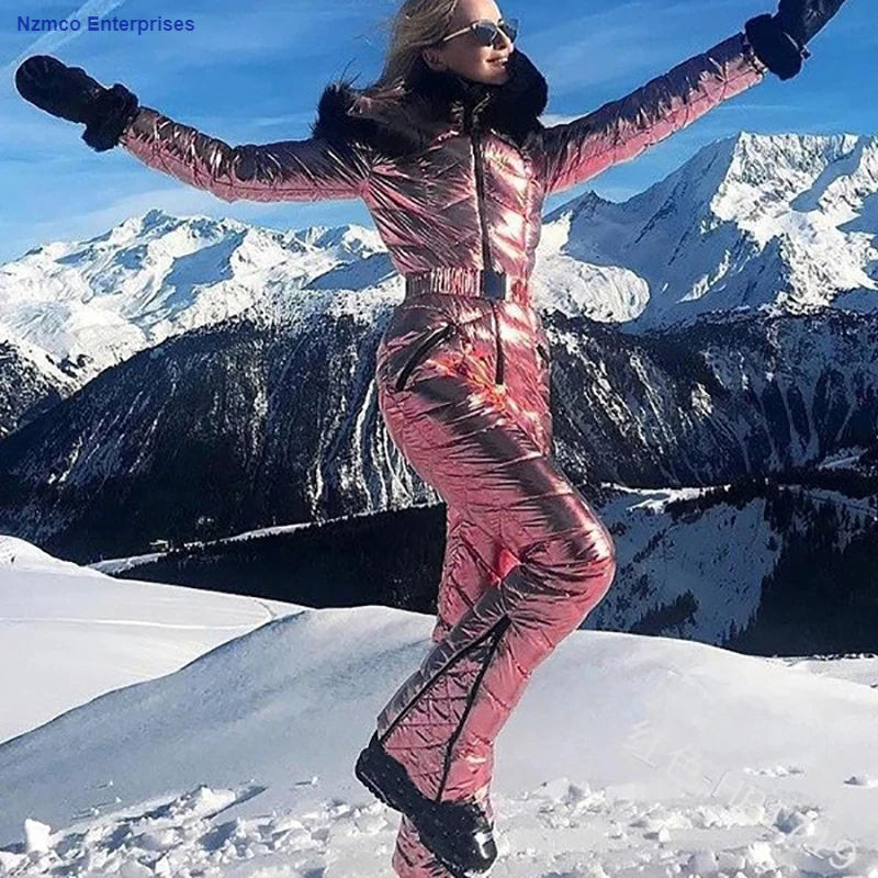 Traje de Esquí para Mujer, Mono de Moda con Capucha y Cuello de Piel, Chaqueta de Snowboard para Exteriores, Cortavientos, Cálida, Térmica, Estampada, de Poliéster/Tafetán
