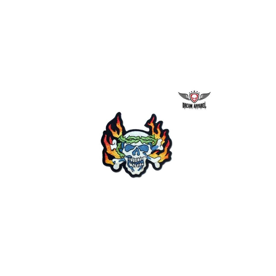 Parches de calavera con llamas y enredaderas verdes en la cabeza