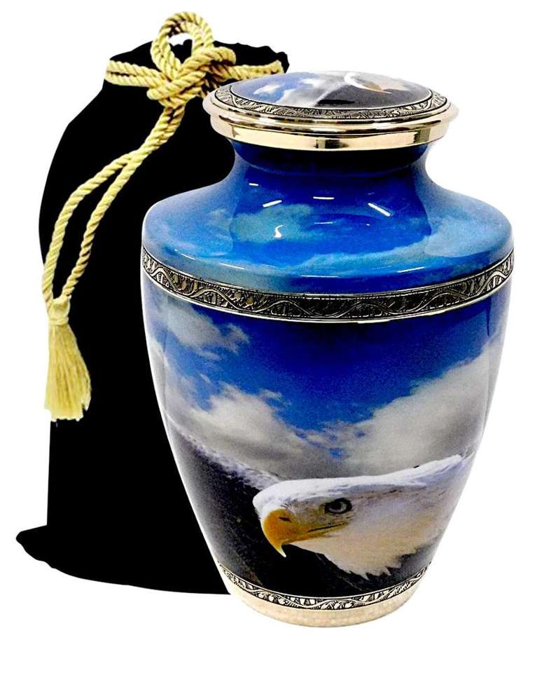 Urna de cremación de Metal antiguo para cenizas para adultos, grabado con imagen de águila azul cielo, estilo americano/europeo, venta al por mayor