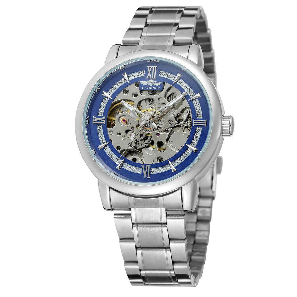 Reloj automático elegante con esfera azul con números romanos, función luminosa, resistente al agua, de acero inoxidable para hombre.