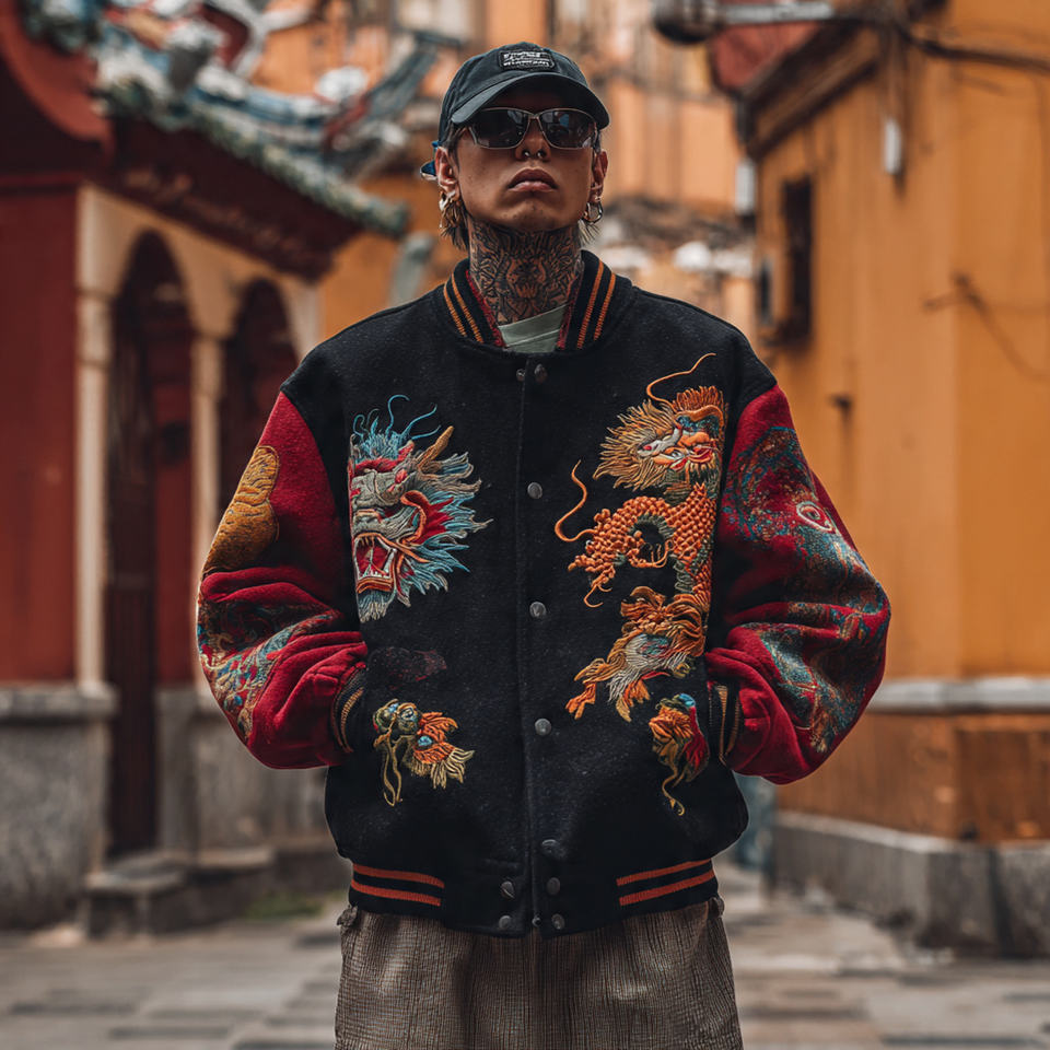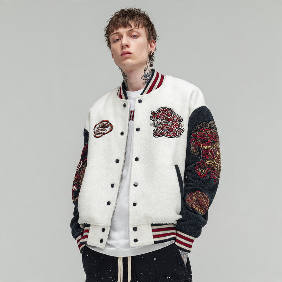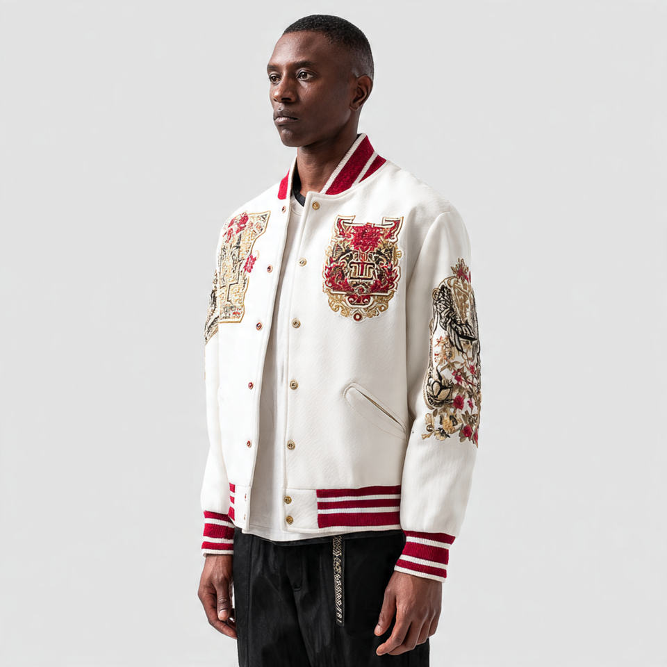 Nombre del producto:Chaqueta universitaria con mangas bordadas para hombre