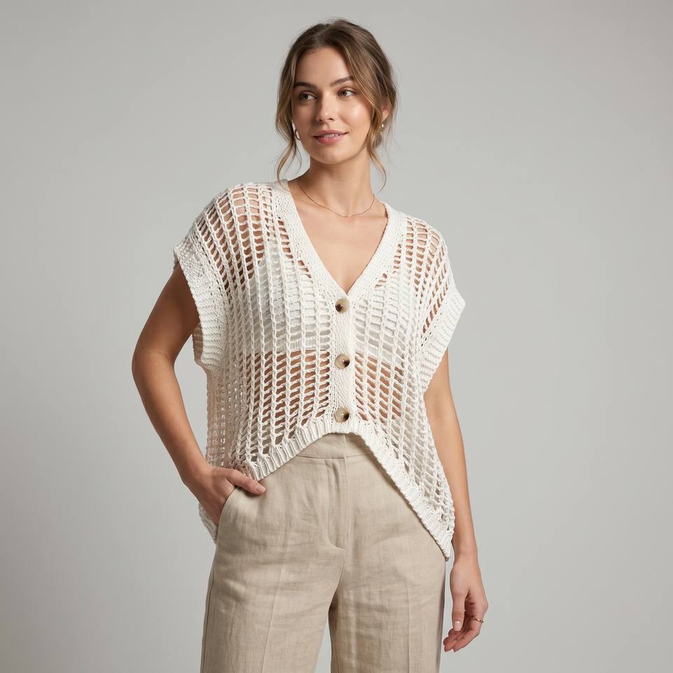 Cárdigan de punto calado sin mangas con botones, 65% algodón, talla única (tallas 36–44)