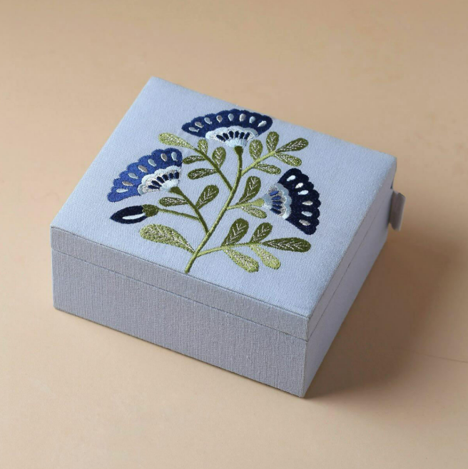 Caja de Almacenamiento de Joyería de Cartón con Cierre Magnético Cuadrado Azul Pequeño, Bordada con Flores, Logotipo Personalizado, Marca EXOTIC INDIAN ART