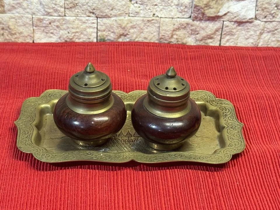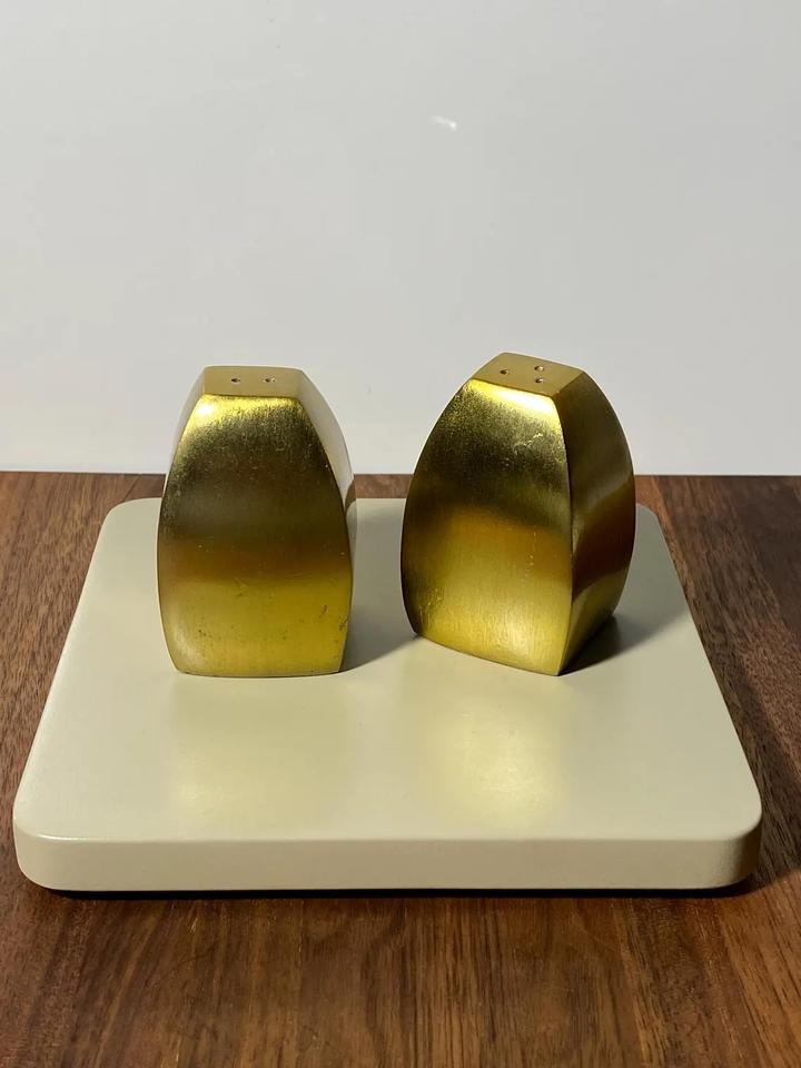 Pequeño juego de sal y pimienta de latón con aspecto vintage y tapas fáciles de usar diseñadas para configuraciones compactas de comedor y mesas de servicio