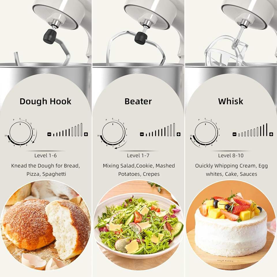 Accesorios:Gancho de amasar, Batidora plana, Tazón de mezcla, Escudo de vaciado, Latigo de alambre
