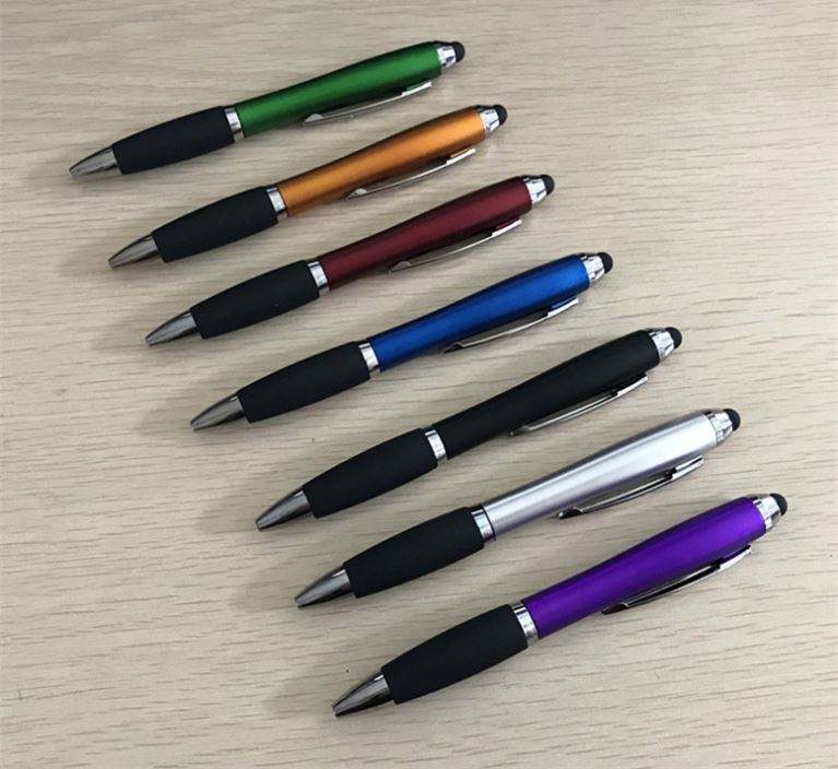 Pequeño MOQ logotipo personalizado publicidad al por mayor colores metálicos plástico Stylus bolígrafo