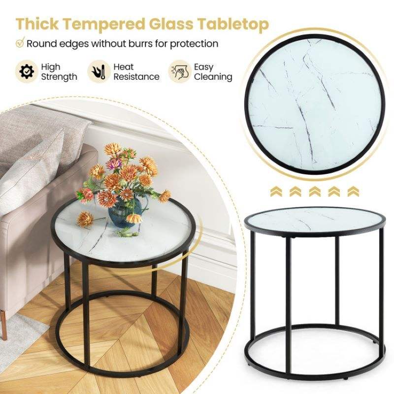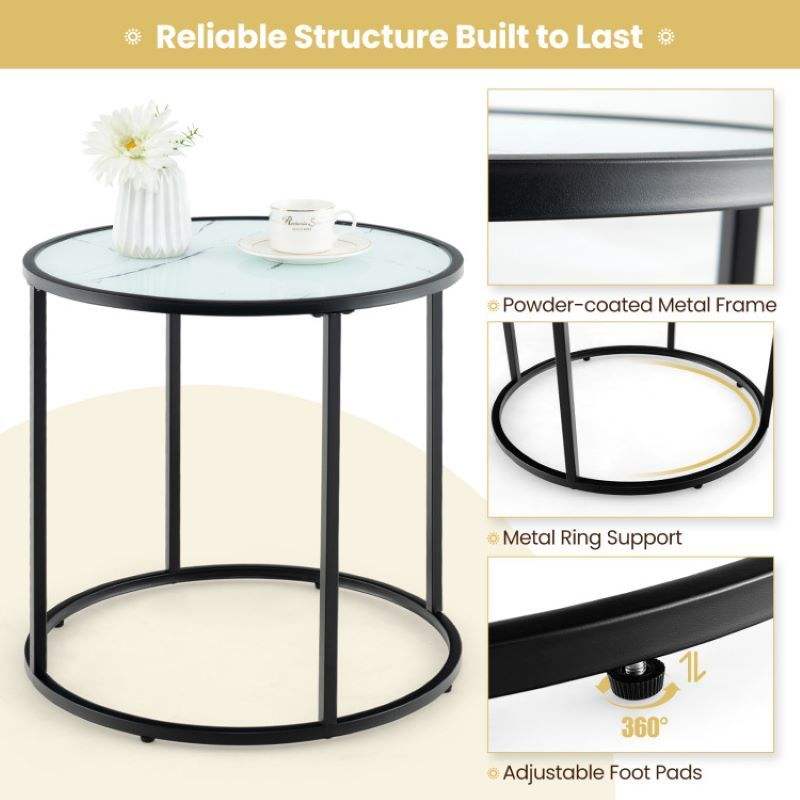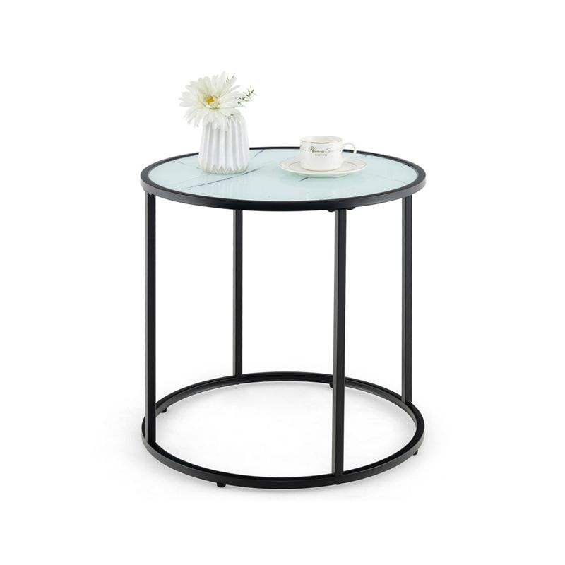 Mesa de Centro Pequeña con Estructura Metálica y Tapa de Vidrio Imitación Mármol