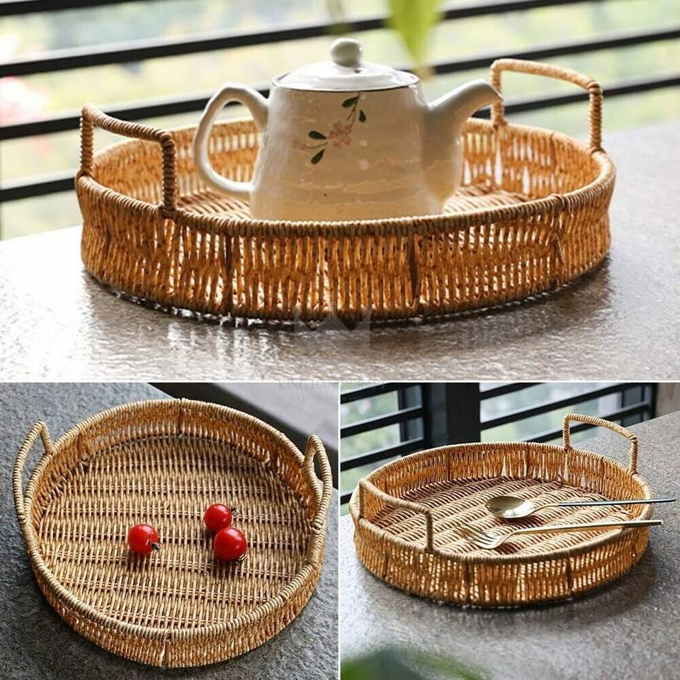 Bandeja Redonda Pequeña de Mimbre para Servir con Asa Vajilla de Cocina