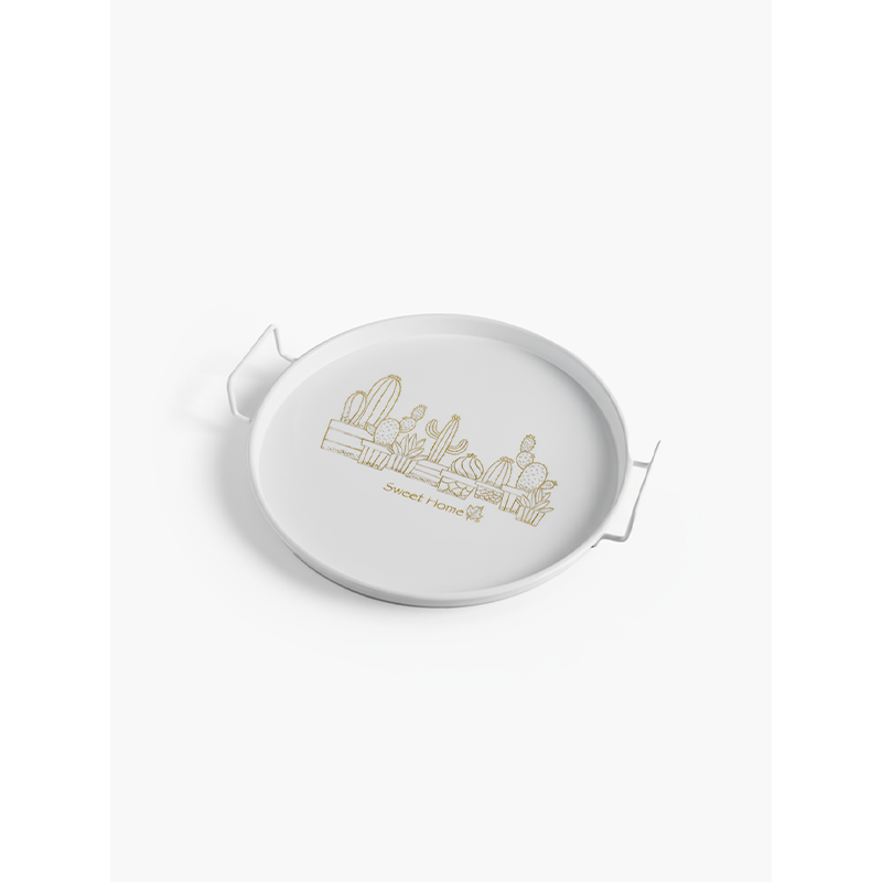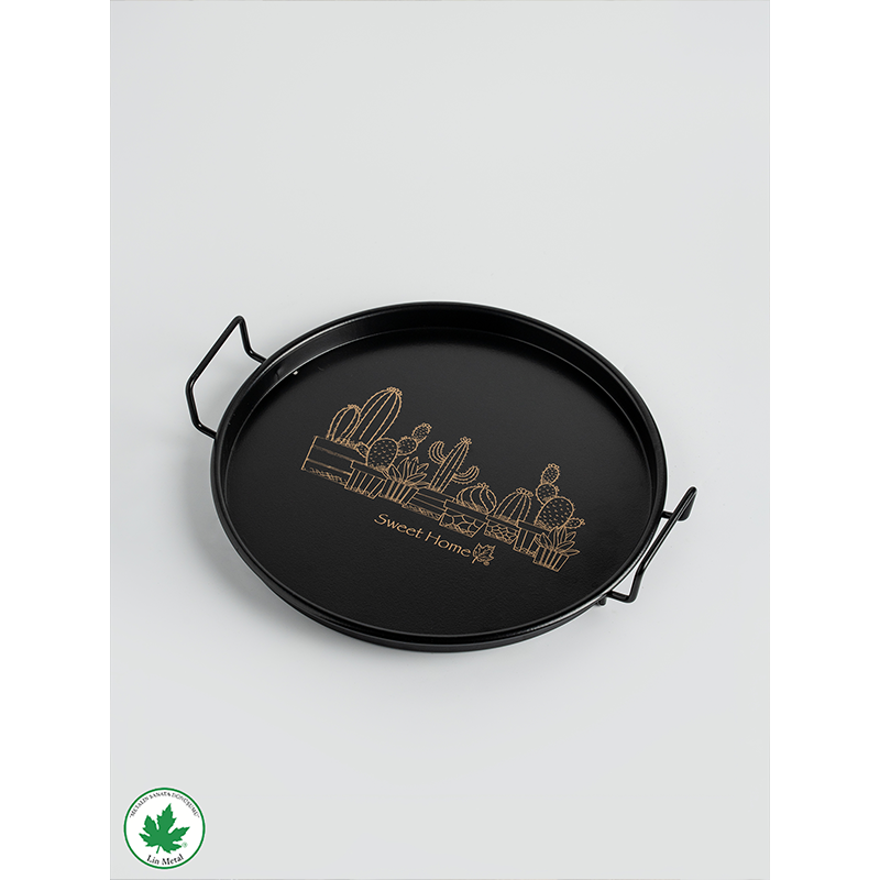 Bandeja redonda pequeña de metal galvanizado de 24 cm con textura suave, asas de alambre e impresión personalizada.