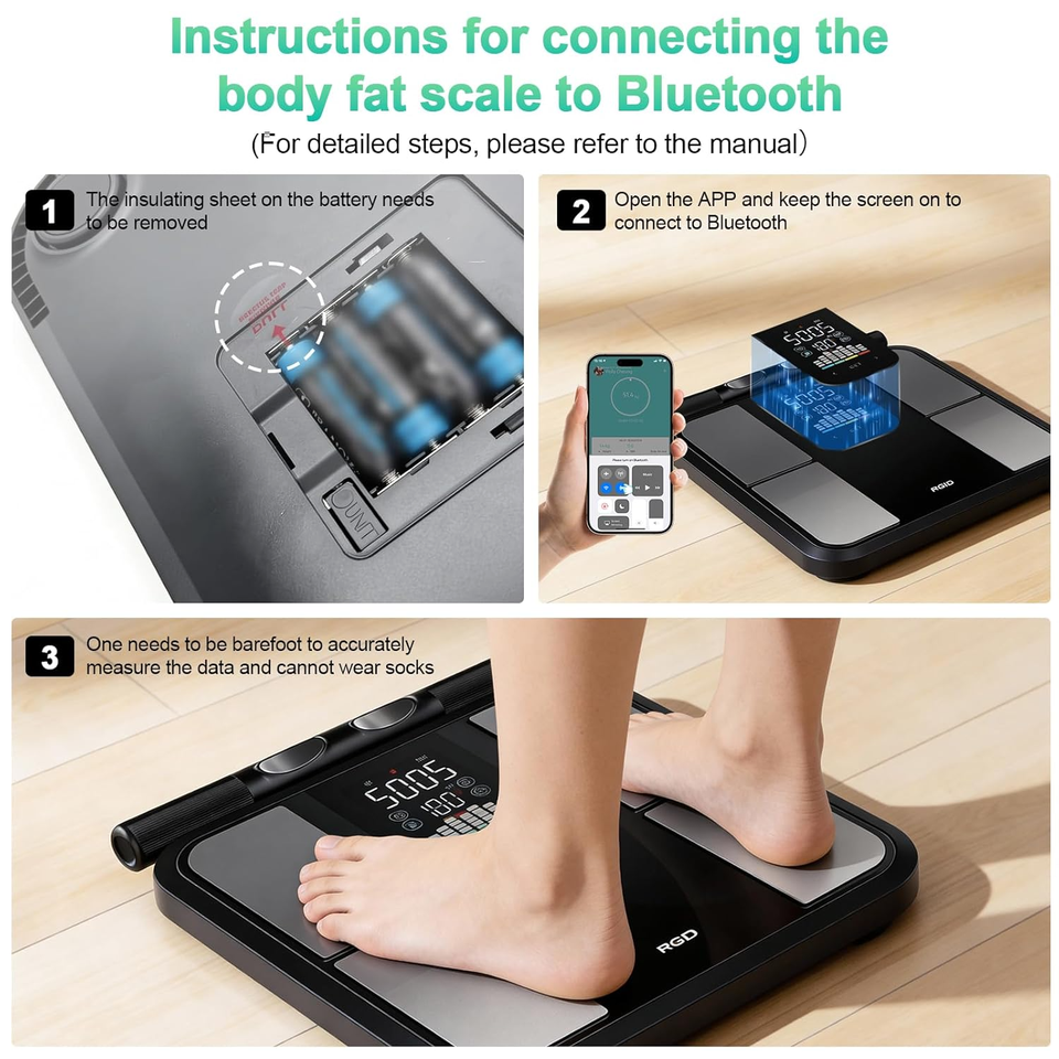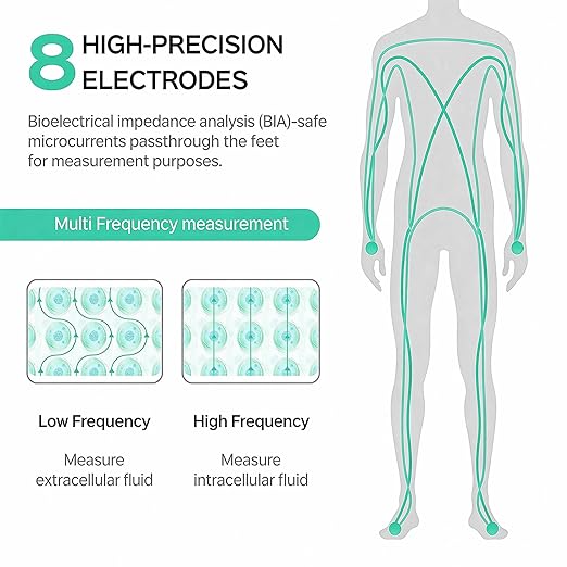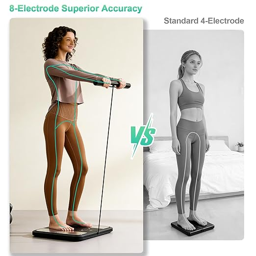Báscula Inteligente de Grasa Corporal con 8 Electrodos, Pantalla a Color, 58 Datos, IMC, Grasa Muscular y Visceral, Sincronización con APP, 24 Usuarios, Modo Sin Conexión, Bluetooth