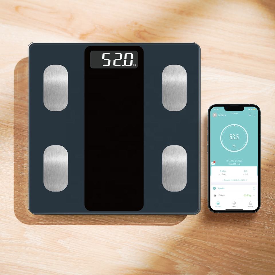 Báscula inteligente de grasa corporal, báscula de baño, análisis de impedancia, 13 métricas corporales, báscula electrónica inteligente de diente azul
