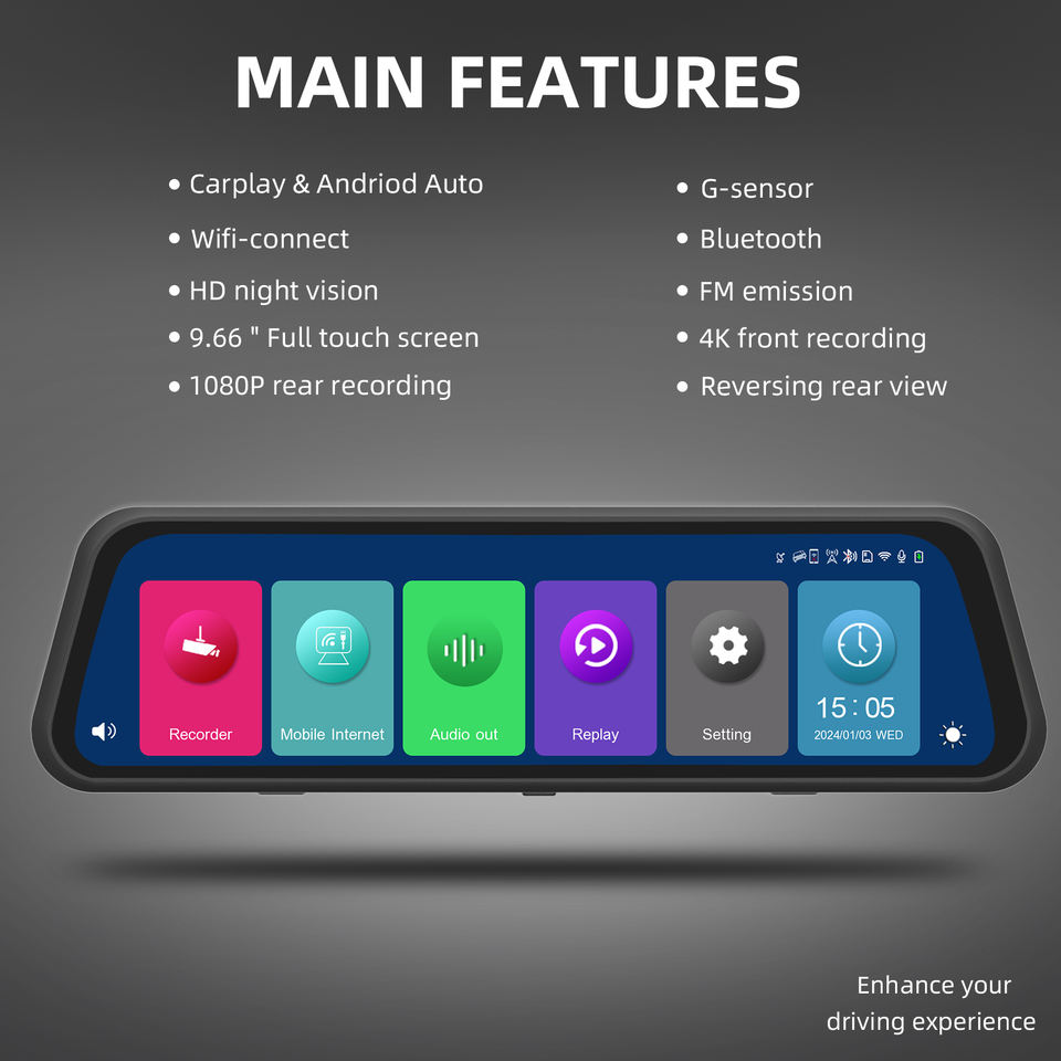 Monitor de coche inteligente Carplay Auto Wifi Dash Cam cámara delantera y trasera de coche FHD grabadora de espejo retrovisor de coche Cámara 4K HD