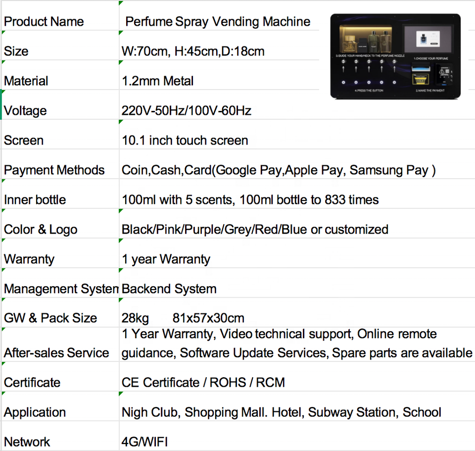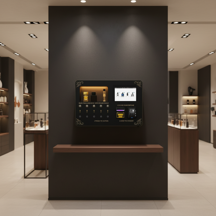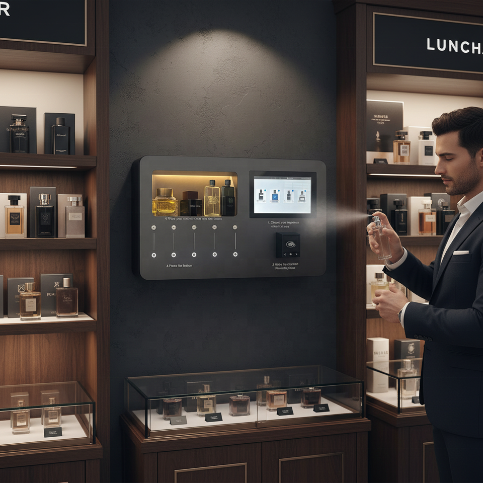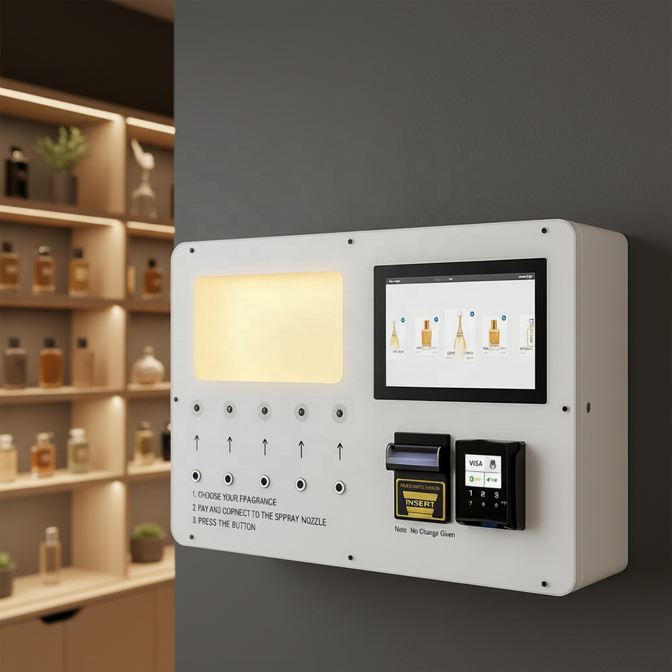 Máquina Expendedora Inteligente de Perfume con Pantalla Táctil, Dispensador de 5 Fragancias, Acepta Monedas y Tarjetas, Compatible con Google y Apple Pay