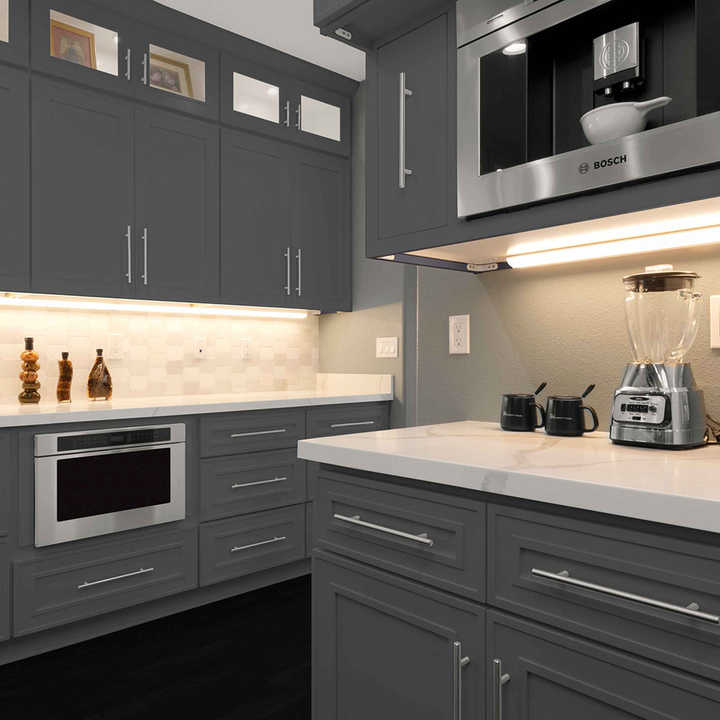 Gabinete de cocina moderno inteligente, carcasa de madera maciza, puerta de MDF, acabado de puerta de PVC, tratamiento de superficie de laca, bisagra, diseño de muebles