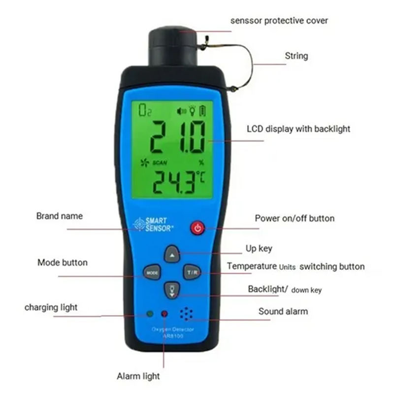 Detector de Oxígeno Portátil con Sensor Inteligente AR8100, Analizador de Gases de Oxígeno, Rango de Medición de Concentración de O2 0-30%, Detector y Probador