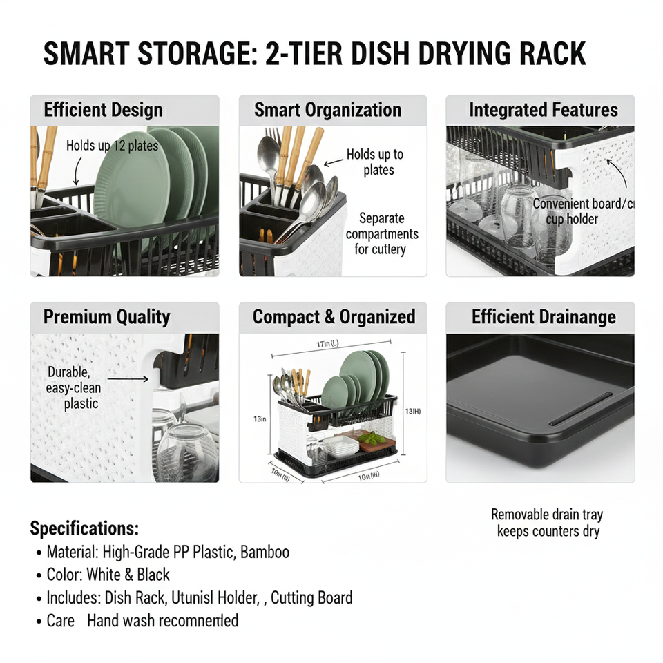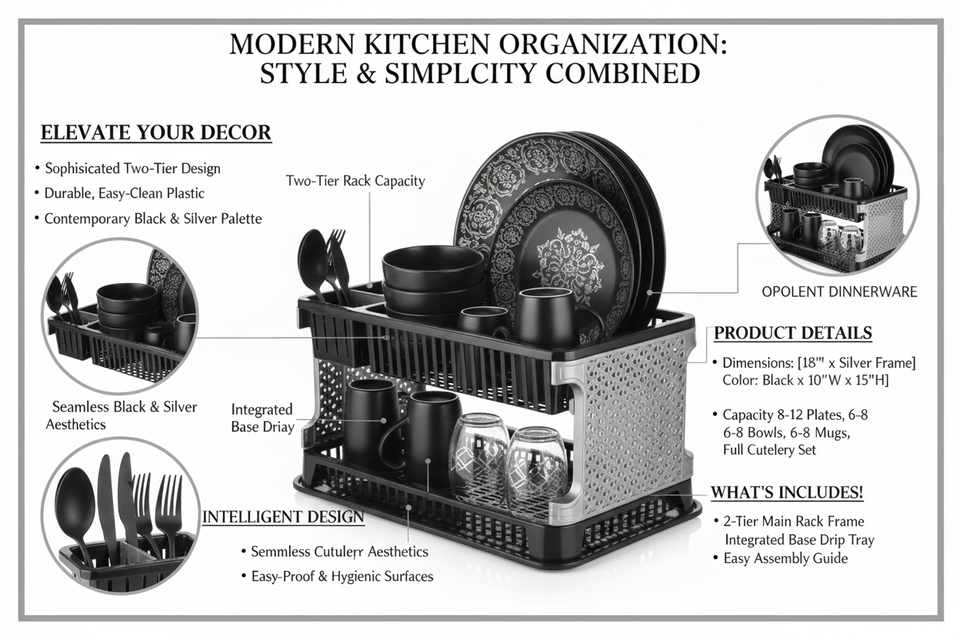 Estante Escurridor de Platos Inteligente que Ahorra Espacio – Elegante Organizador de Cocina de 2 Niveles con Accesorios Desmontables