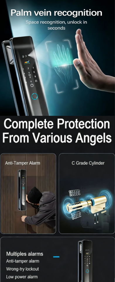 Unlock way:Phone + Palm +Face+Fingerprint + Password + Card + Key