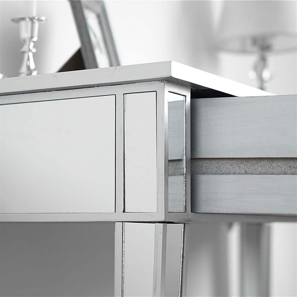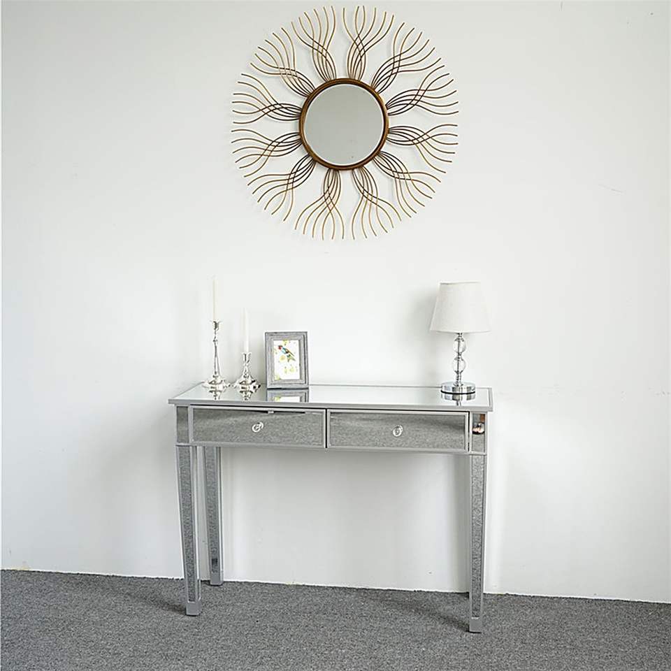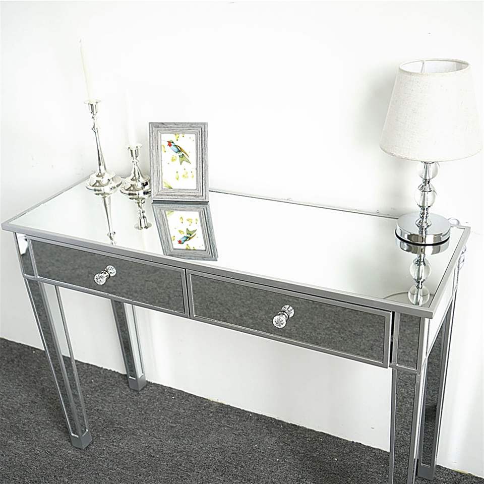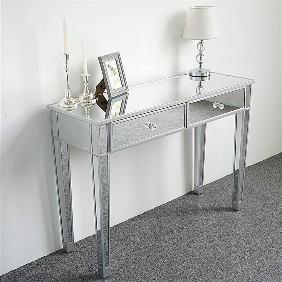 Mesa Consola Multimedia con 2 Cajones, Acabado Plateado Mate Espejado, Tocador y Escritorio para Oficina en Casa para Mujeres