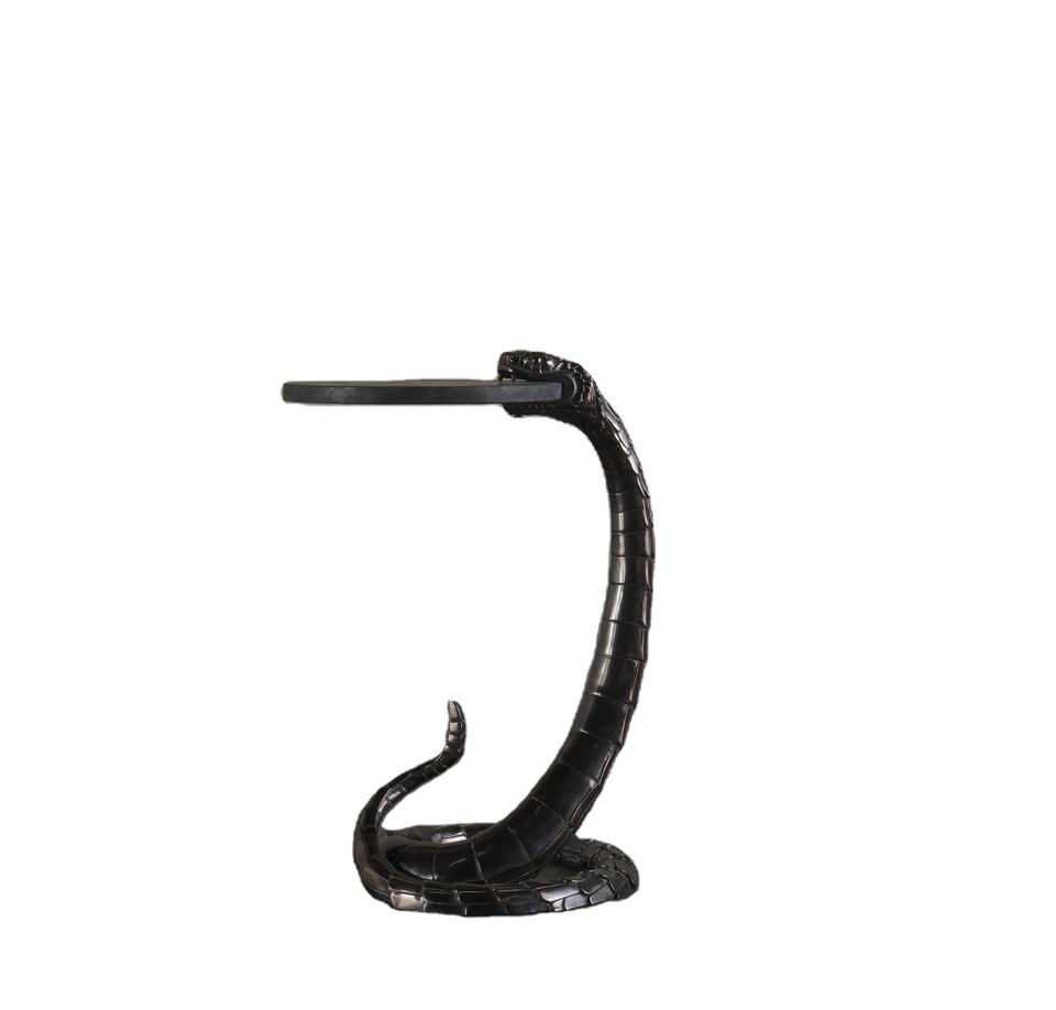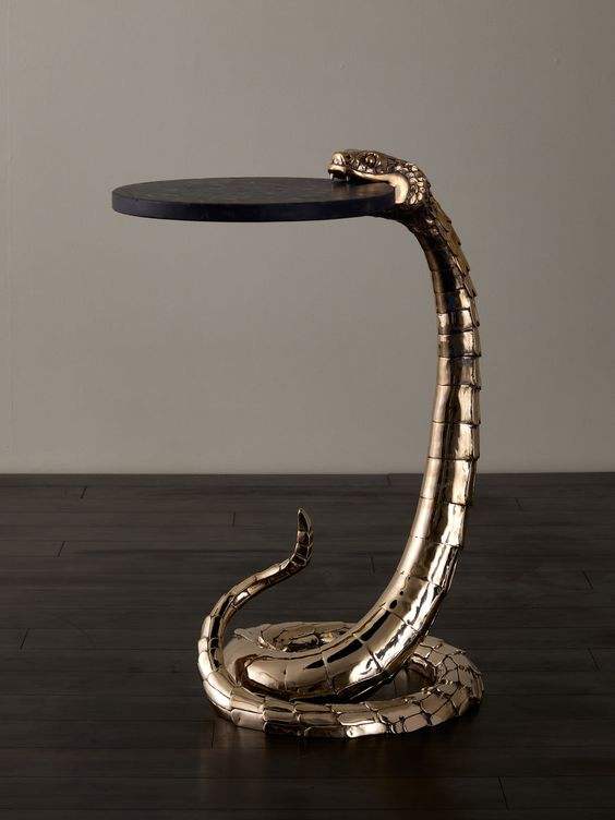 Mesa Consola con Tapa de Cristal Estilo Serpiente, Estructura Metálica con Incrustaciones de Hueso, Diseño Metálico Único
