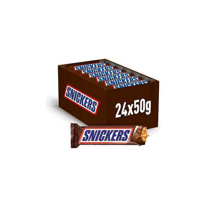 Barra Snickers de 50g disponible en cajas de cartón para pedidos al por mayor