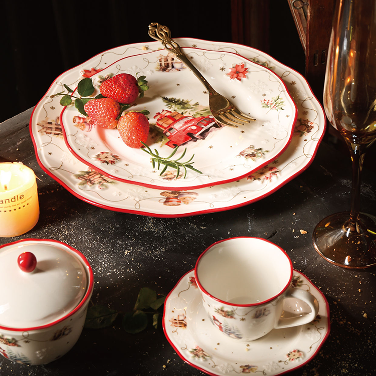 Juego de vajilla navideña de porcelana de lujo: platos y cuencos de cerámica decorativa con relieve de copos de nieve y borde rojo