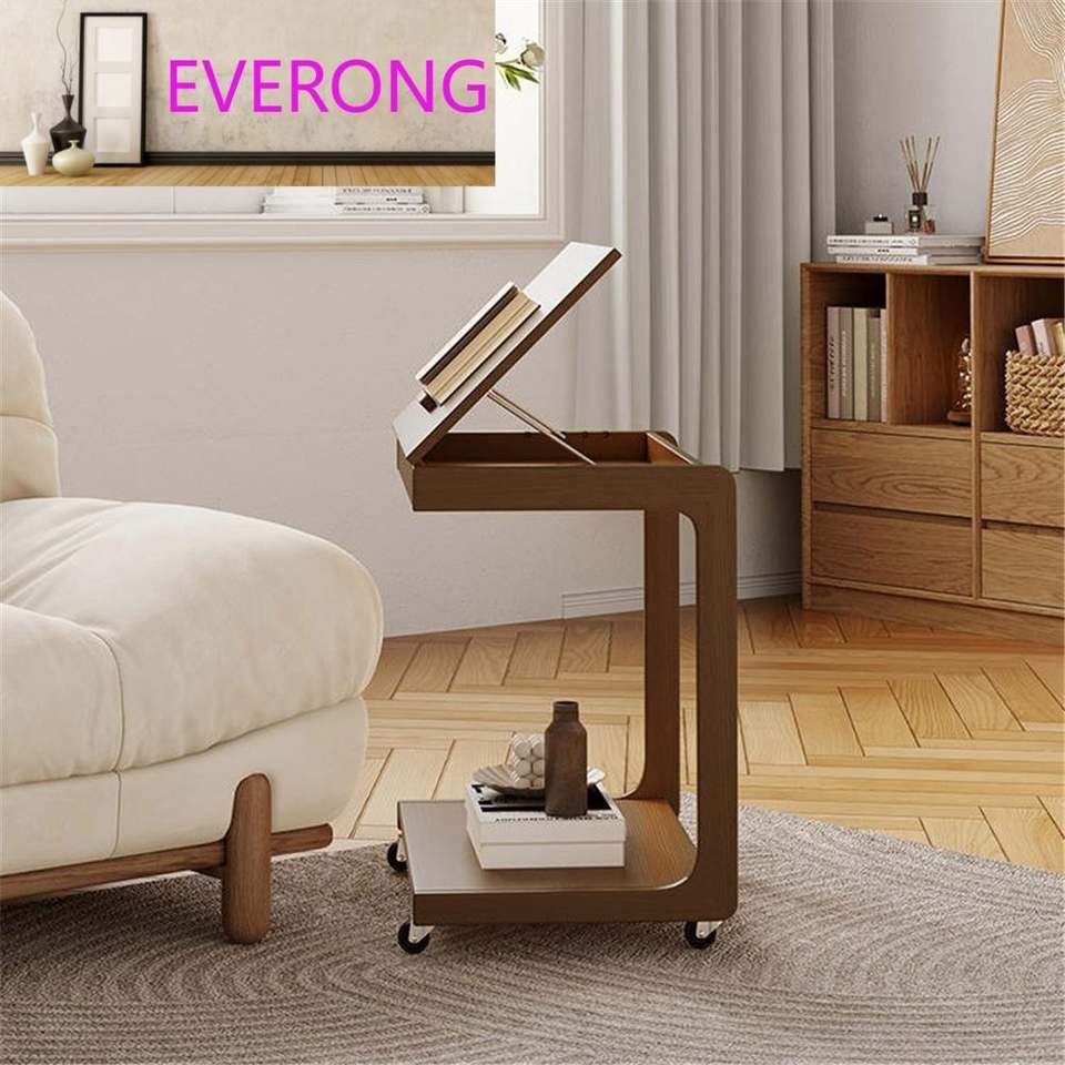 Mesa Auxiliar para Sofá con Ruedas Universales, Mesa de Centro de Madera Maciza, Mesa Auxiliar Móvil en Forma de C para Sala de Estar, Mesa de Centro para Computadora