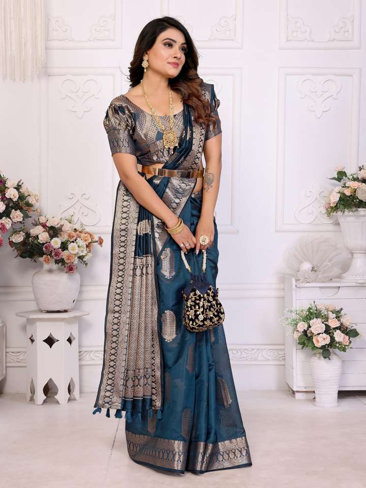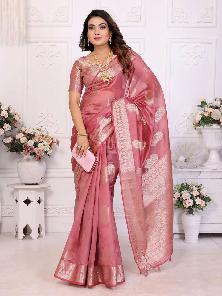 Banarasi de seda de organza suave con colección de Sari de borde tejido Jari dorado para mujer